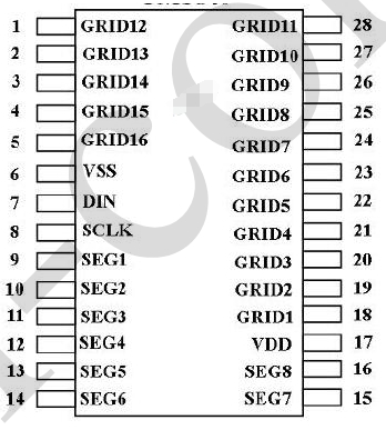 GRID1-GRID16:位輸出,N管開漏輸出,用于控制LED的各個段。
