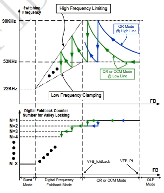 當負載減輕時,LP8773H進入“數字頻率監控”模式。在這種模式下,系統頻率會在最高限制頻率和最低限制頻率之間動態調整。芯片通過內置的數字計數器選擇和鎖定谷底,從而實現高效的功率轉換。這種模式特別適合輕載或小功率輸出場景,能夠顯著降低系統的功耗。
