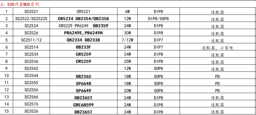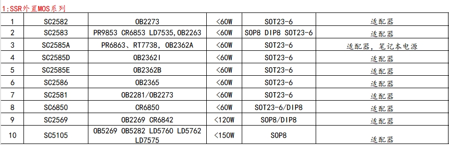 SSR內(nèi)置MOS系列是鼎芯微電子推出的另一類(lèi)高效電源管理芯片,適用于適配器、小家電等應(yīng)用場(chǎng)景。以下是該系列部分型號(hào)及其替代型號(hào):