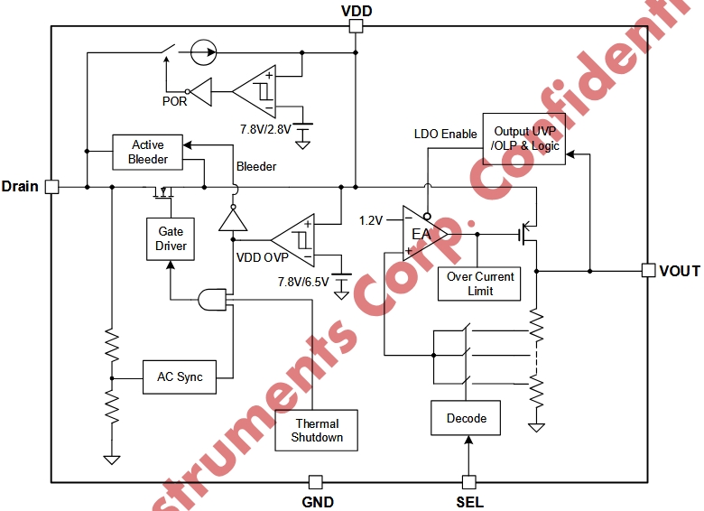 | 5,6,7,8 | Drain | 內部功率MOSFET漏極引腳。在電壓處于充電窗口內時提供能量。 |