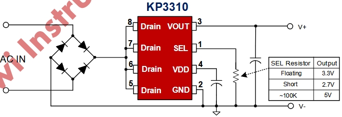 該芯片支持多種輸出電壓選項,包括5V、3.3V和2.7V,通過SEL引腳進行編程選擇。這種靈活性使得KP3310SGA能夠適應多種應用場景,滿足不同設備對電源電壓的需求。