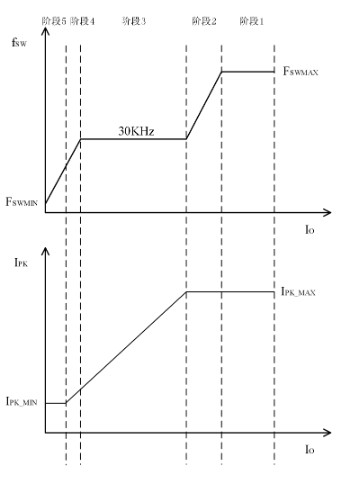 芯片僅需1uA的啟動電流,系統上電后通過內部啟動供電電路對VCC的電容進行充電,當VCC電壓達到芯片開啟閾值時,芯片內部控制電路開始工作。此時啟動供電電路會繼續維持供電,使得輸出電壓能正常的上升建立。當輸出電壓上升且穩定工作后,VCC靠輸出電壓給VCC供電。