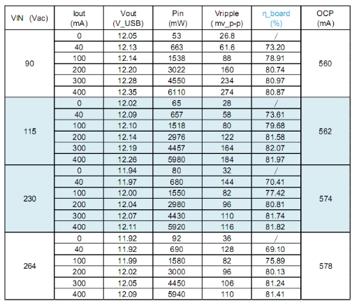 測試報告詳細記錄了該電源方案的各項測試數據和結果。在紋波、調節和效率測試中,其紋波電壓在不同輸入電壓和負載條件下均能夠保持在較低水平,表現出良好的輸出穩定性。在效率方面,隨著輸入電壓的升高和負載的增加,其效率也相應提高,最高可達 82.07%,顯示出較高的能量轉換效率。