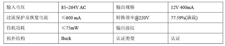 在過流保護方面,該方案的過流保護及恢復電流為≤600 mA,能夠有效防止因電流過大而導致的損壞。在轉換效率方面,當輸入電壓為 220V 時,其轉換效率高達 77.59%(滿載),這一高效的轉換效率不僅能夠減少能源浪費,還能降低電源的發熱量,提高電源的使用壽命。此外,該方案的待機功耗僅為≤75mW,符合現代節能理念。其拓撲結構為 Buck,這種結構具有簡單、高效、穩定的特點,能夠有效提高電源的性能和可靠性。在認證類型方面,該方案已經通過了相關認證,確保了其符合安全和質量標準。