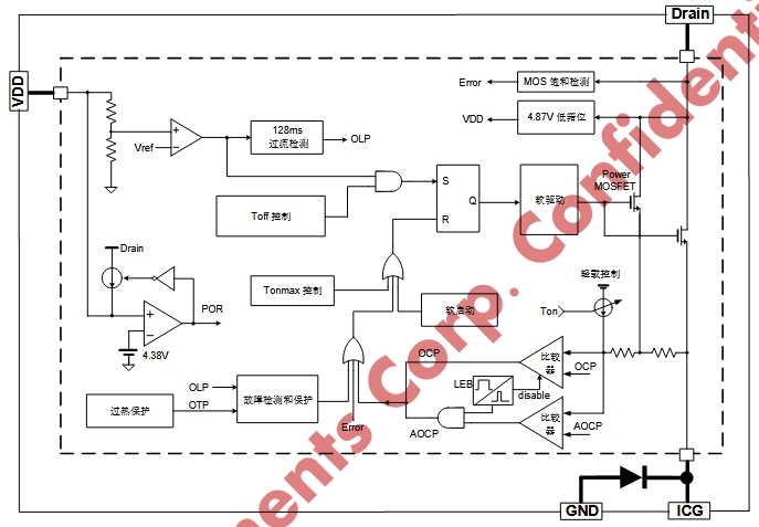 • 逐周期電流限制:芯片內部差分采樣電路采樣流經高壓 MOSFET 的電流,當電流超過設定閾值時,MOSFET 立即關斷,直至下一個周期重新開通。