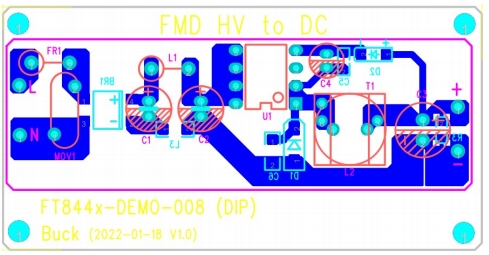 PCB布局對于電源性能至關(guān)重要,F(xiàn)T8440BD2方案采用了單面板雙面元件的設(shè)計,PCB厚度為1mm。PCB頂面為插件元件,底面為貼片元件。這種布局方式不僅節(jié)省空間,而且便于生產(chǎn)和維護。