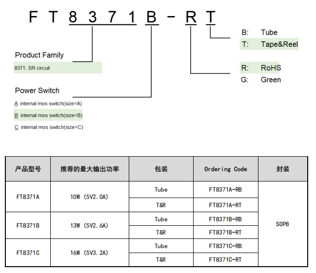 • FT8371A-RB:表示FT8371A型號,采用SOP8封裝,管狀包裝。