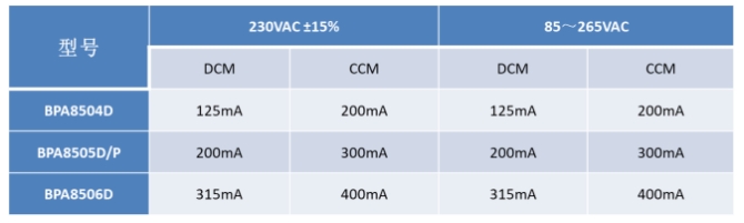 輸出電流:在230VAC±15%條件下,可提供315mA(DCM)和400mA(CCM)的輸出;在85~265VAC條件下,提供315mA(DCM)和400mA(CCM)。