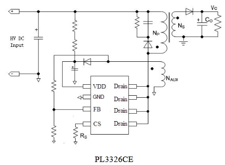 PL3326CE的典型應用電路簡單且高效。芯片通過輔助繞組采樣輸出電壓,實現恒壓/恒流控制。在恒壓工作模式中,內部誤差放大器對采樣的電壓進行調節,從而得到恒定的輸出電壓。在恒流工作模式中,芯片保持輸出電流恒定,不受輸出電壓大小的影響。
