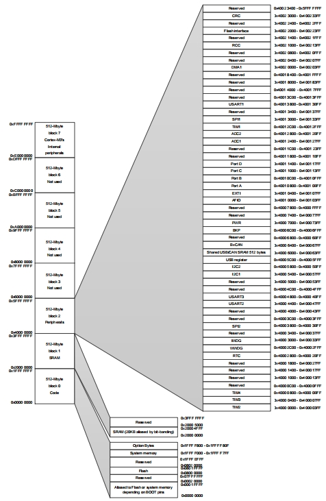 存儲器映射如圖所示,詳細列出了各個存儲器區域的地址范圍,包括Flash、SRAM、外設等。