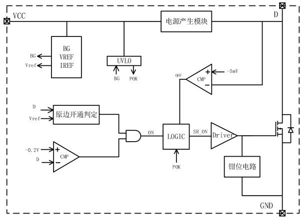 LP3588BS是由芯茂微推出的一款高性能開關電源同步整流芯片,專為充電器和適配器的同步整流應用而設計。它支持DCM(不連續導通模式)和CCM(連續導通模式)多種工作模式,能夠有效提升電源轉換效率,降低功耗。該芯片采用SOP8L封裝,具有緊湊的尺寸和良好的散熱性能,非常適合高功率密度的應用場景。內部框架圖如下所示