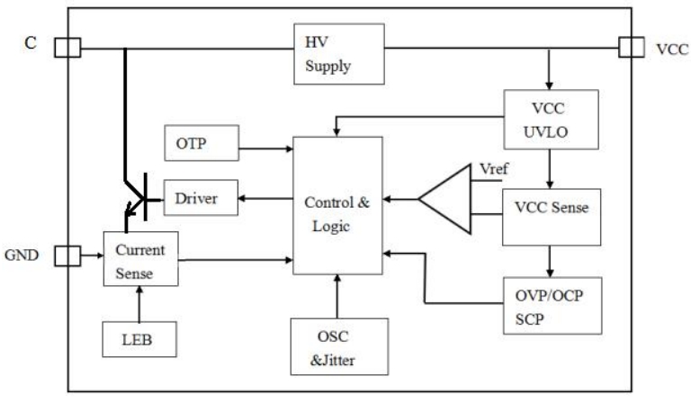 一顆芯片 = 高壓啟動 + BJT 功率級 + 恒壓控制 + 全套保護,外圍僅需 6 個元件即可工作。