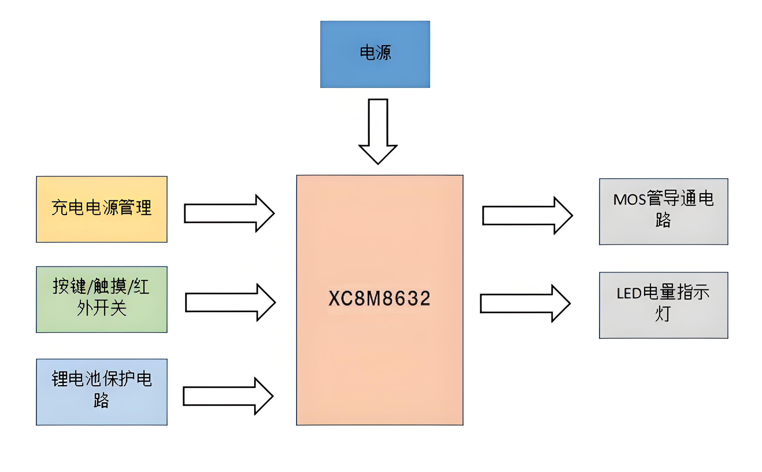 在本方案中,主控電弧打火機芯片采用矽杰微單片機XC8M8632,支持定制開發(比如:觸摸開關、紅外開關、電量顯示等),該點煙器芯片主要負責功能如下: