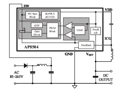 AP8505同樣基于高壓同步整流架構(gòu),集成PFM控制器以及500V高可靠性MOSFET,用于外圍元器件極精簡的小功率非隔離開關(guān)電源。AP8505的特點(diǎn)包括: