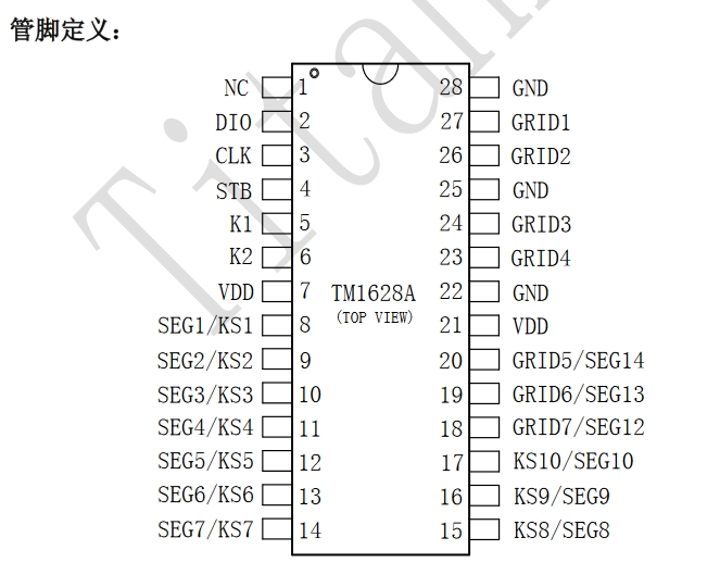 CMOS工藝:TM1628A采用CMOS工藝制造,確保了產(chǎn)品的可靠性和穩(wěn)定性。