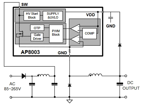 AP8003是一款集成了PFM控制器及500V高可靠性MOSFET的非隔離交直流轉換芯片。它具備以下特性: