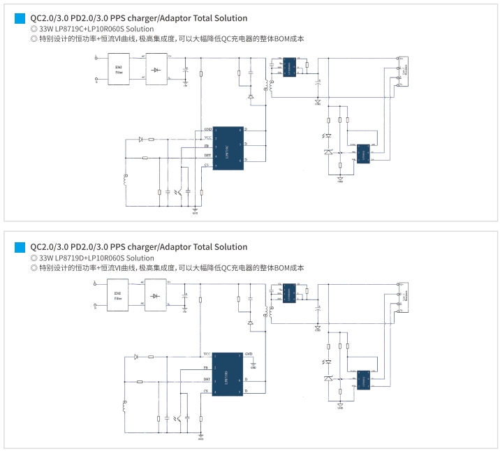 LP8719C/D是一款高效的PWM控制器,它支持33W的輸出功率,并能夠根據(jù)設(shè)備的充電需求動(dòng)態(tài)調(diào)整輸出電流和電壓。這款控制器的恒功率+恒流VI曲線設(shè)計(jì),確保了充電過程中的穩(wěn)定性和效率。