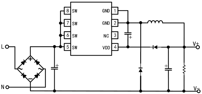 芯片內(nèi)部集成了高壓?jiǎn)?dòng)電路、電流采樣電路和電壓反饋回路,無(wú)需外部啟動(dòng)電阻、電流采樣電阻和電壓采樣電阻,進(jìn)一步降低了系統(tǒng)成本和體積。