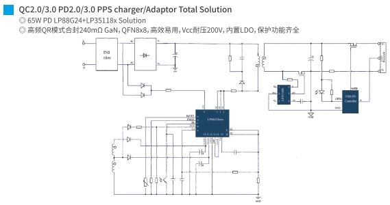 在現(xiàn)代電子設(shè)備中,快速充電技術(shù)已成為提升用戶體驗的關(guān)鍵因素之一。65W PD(Power Delivery)快充方案,以其高效率、高兼容性和高安全性,成為眾多電子設(shè)備制造商的首選。本文將深入探討兩種主流的65W PD快充方案:LP8776CD+LP35116PT和LP88G24+LP35118X,分析它們的技術(shù)特點和應用優(yōu)勢。