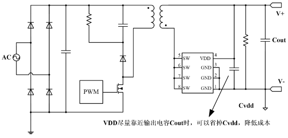 PL3330 內(nèi)部集成 VDD 檢測電路,系統(tǒng)上電完成前,功率管一直處于斷開狀態(tài),副邊電流流過功率 MOS