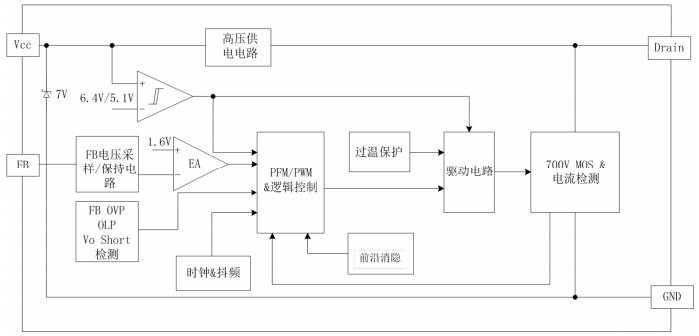 BP8519C在系統上電后,BUS電容通過功率管給VCC電容充電,當VCC電壓達到芯片開啟閾值后,芯片內部控制電路開始工作。芯片內置7V穩壓管,用于VCC電壓鉗位。FB引腳通過采樣電阻在芯片功率管turnoff階段直接采樣輸出電壓,內部調節保持較高的輸出電壓精度。
