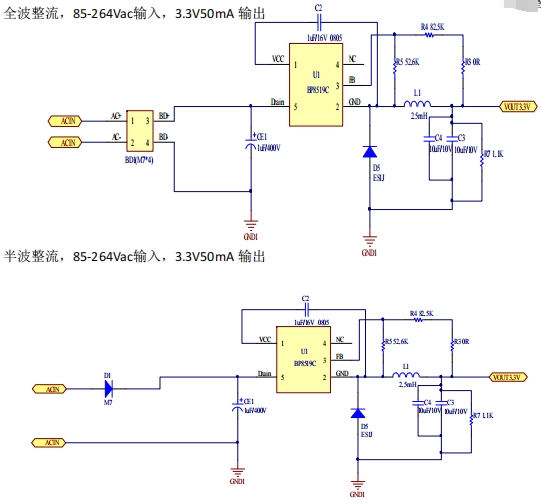 半波整流,85-264Vac輸入,3.3V50mA輸出